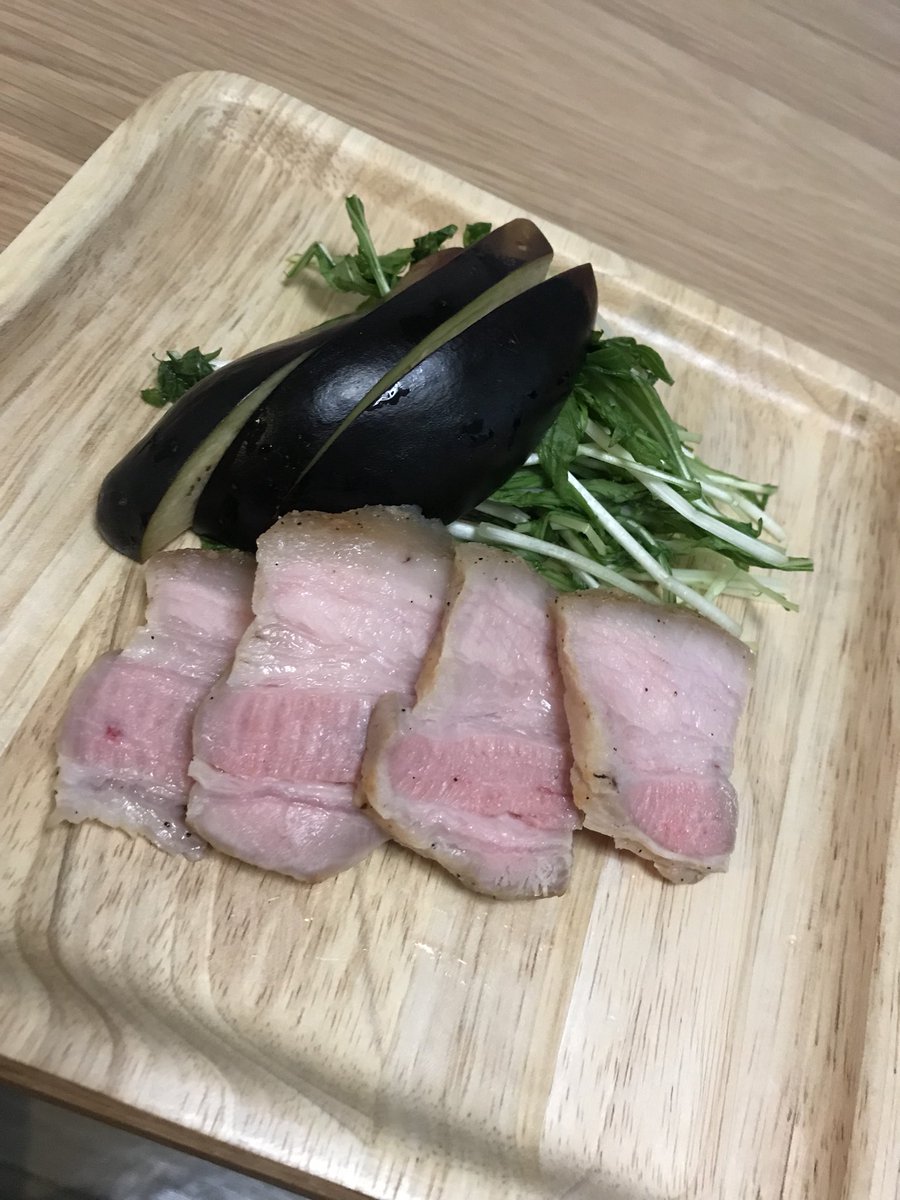 低温調理器を使った試作一号。煮豚用の豚肩ロースを低温調理+最後に焼き色付くまで焼いて塩とトンテキソースで味見。かなり攻めた火入れにしてみたんだけど豚肉は筋繊維をかみ切るのが美味しいような気がするからもっと温度高くてもいいのかも。しばらくは実験の日々になりそうだ。 pic.twitter.com/NAfjxCwHan