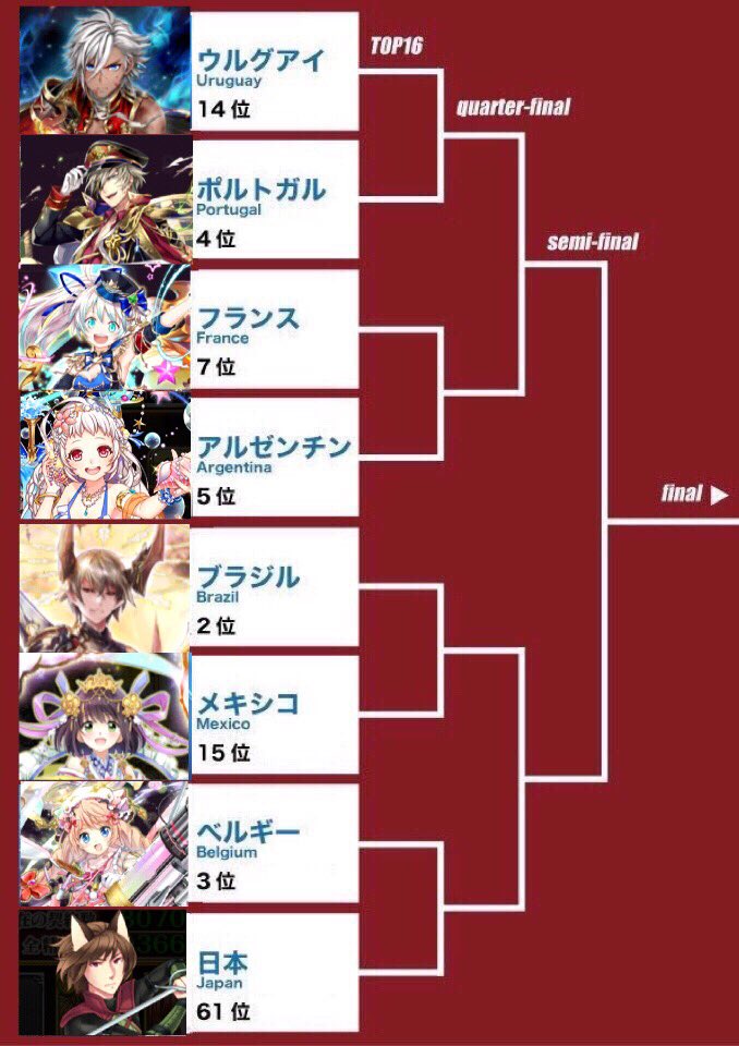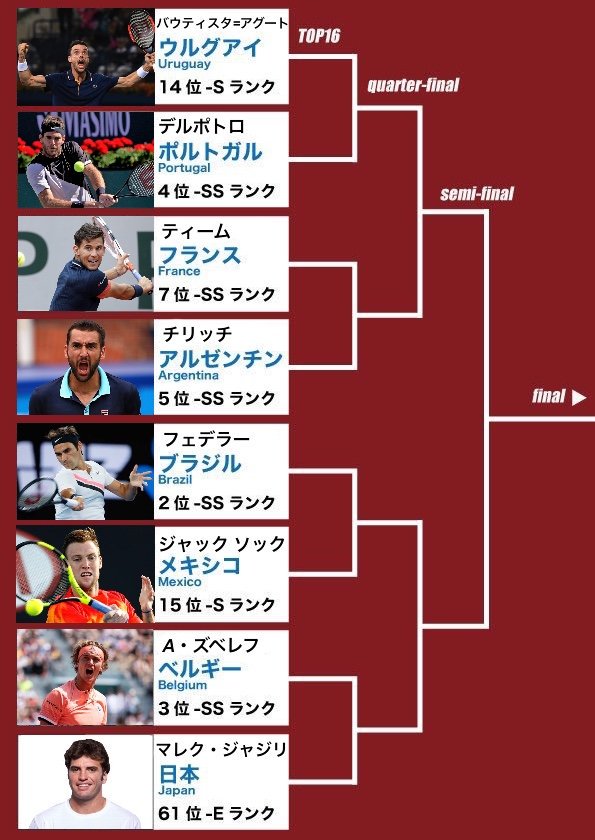 ワールドカップの決勝トーナメント、みんなが他の物で例えていてわかりやすかったから僕もテニス選手に置き換えてみたてに!!